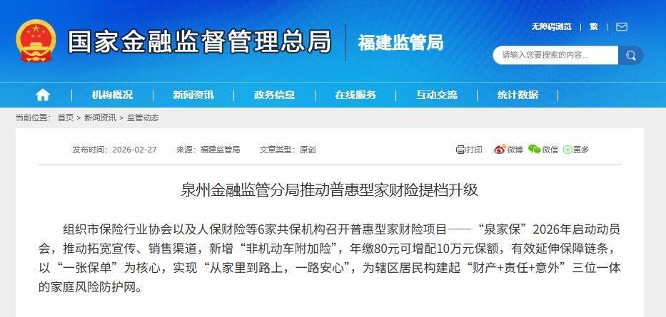2月27日,据福建金融监管局网站,泉州金融监管分局推动普惠型家财险提档升级,组织市保险行业协会以及人保财险等6家共保机构召开普惠型家财险项目——“泉家保”2026年启动动员会,推动拓宽宣传、销售渠道,新增“非机动车附加险”,年缴80元可增配10万元保额,有效延伸保障链条,以“一张保单”为核心,实现“从家里到路上,一路安心”,为辖区居民构建起“财产+责任+意外”三位一体的家庭风险防护网。